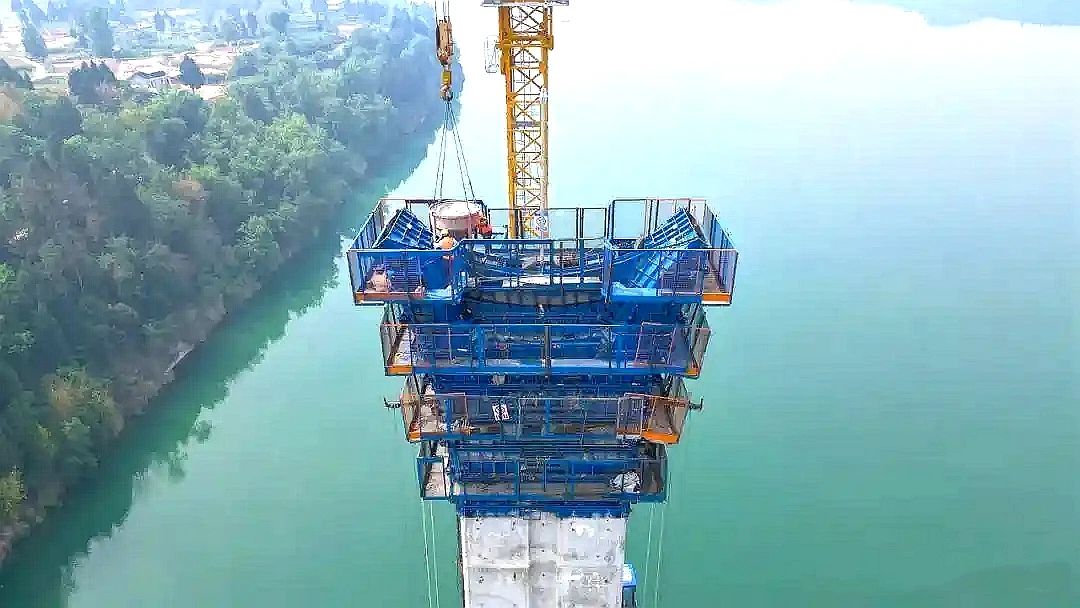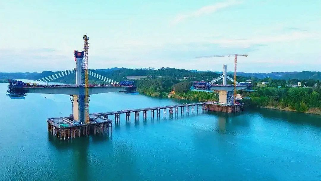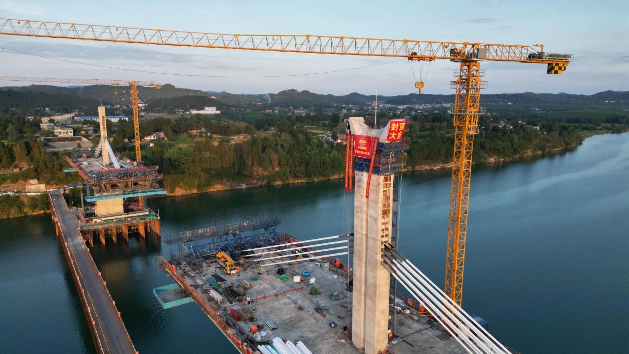 同时,在建设过程中,建设团队实时动态监测主塔应力、位移、变形、索鞍定位等关键指标,加强过程质量控制,确保每节段模板按塔柱设计曲线进行调整,有效提升塔柱线型控制能力,实现大桥主塔如期封顶,确保大桥建设顺利推进。目前,嘉陵江特大桥引桥水中墩下部结构施工已全部完成,正在进行主桥悬浇梁浇筑及斜拉索挂索施工,大桥施工整体进展已达60%。