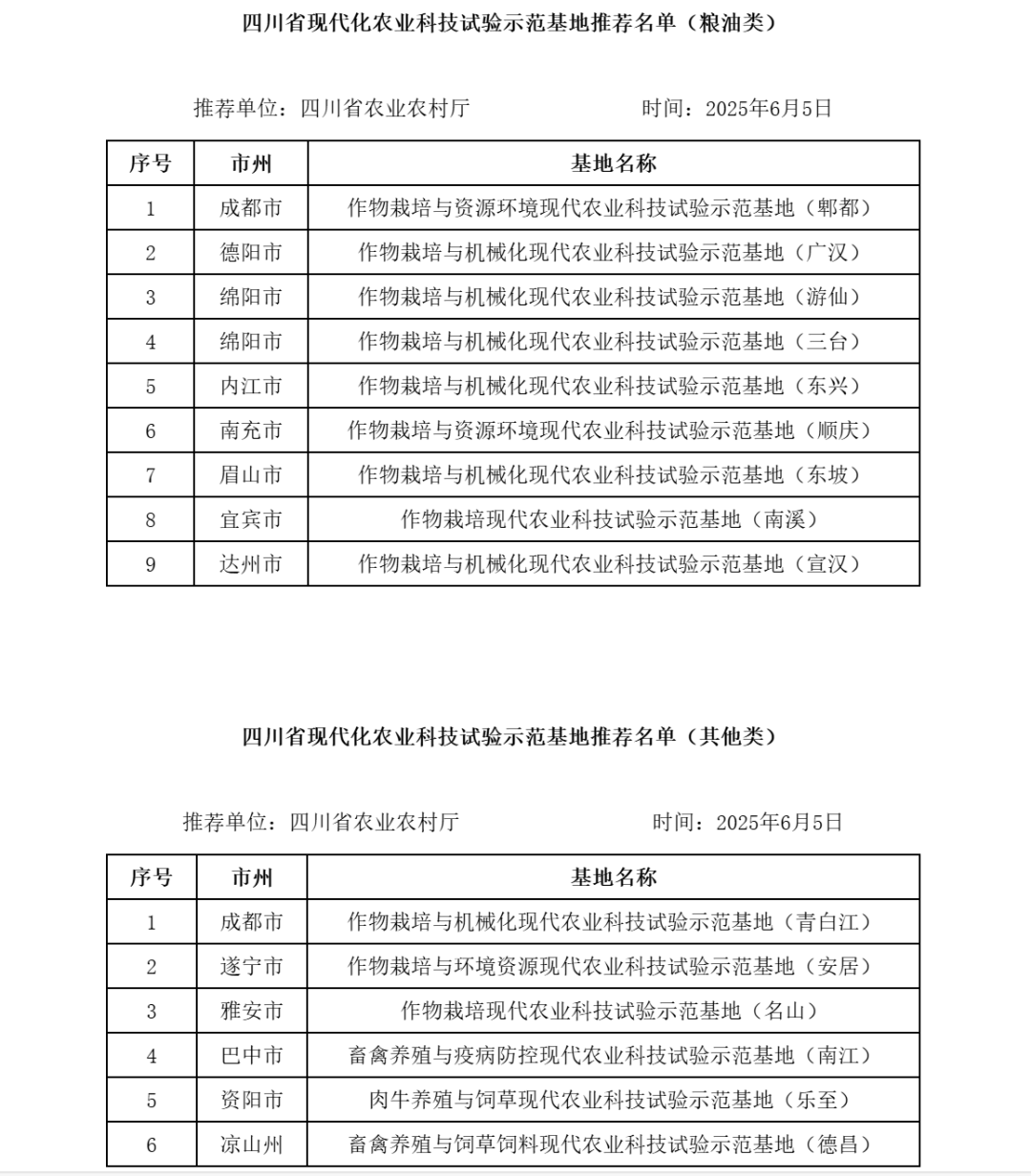 1.四川省现代农业科技试验示范基地推荐名单(粮油类)